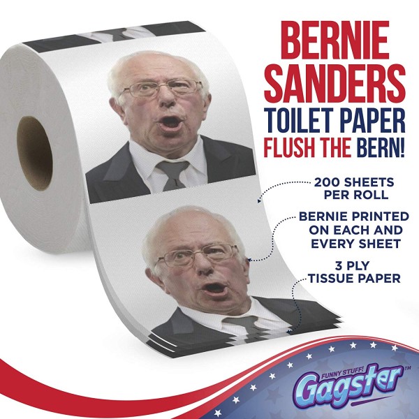 LOVE HIM OR HATE HIM, TAKING A DUMP WILL NEVER BE BORING AGAIN – Every sheet of toilet paper has a flawless full-color image of Bernie Sanders’ face printed on it. The ink will never smudge, bleed, or run.