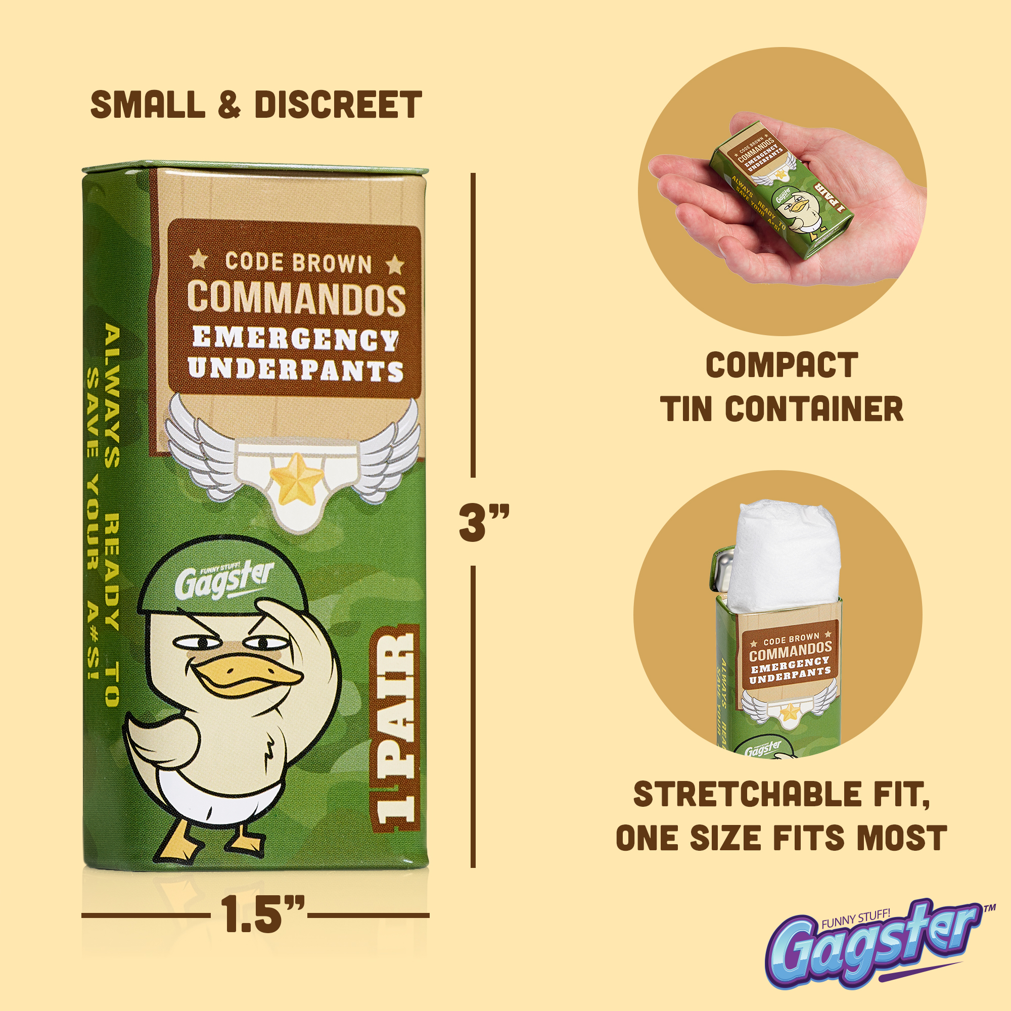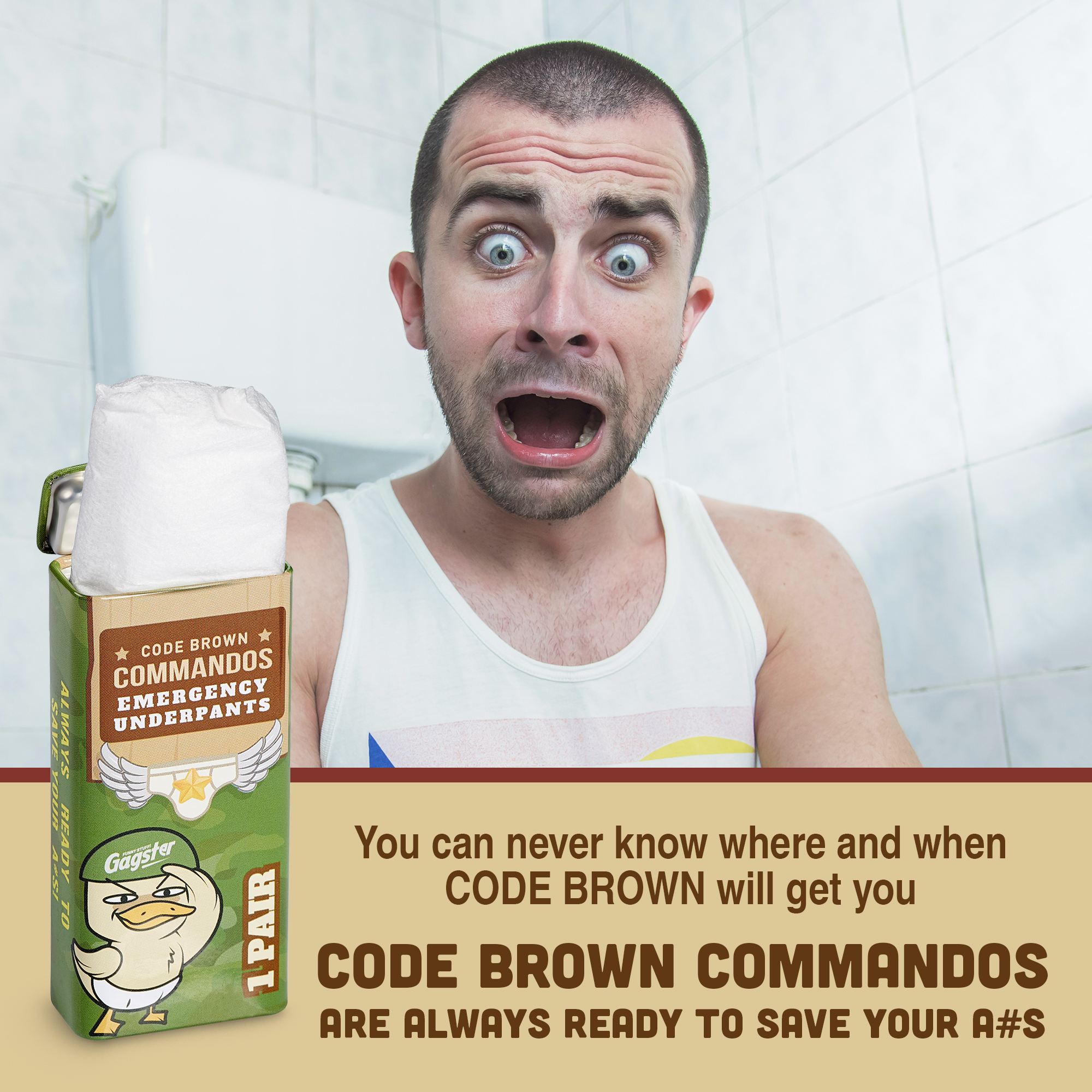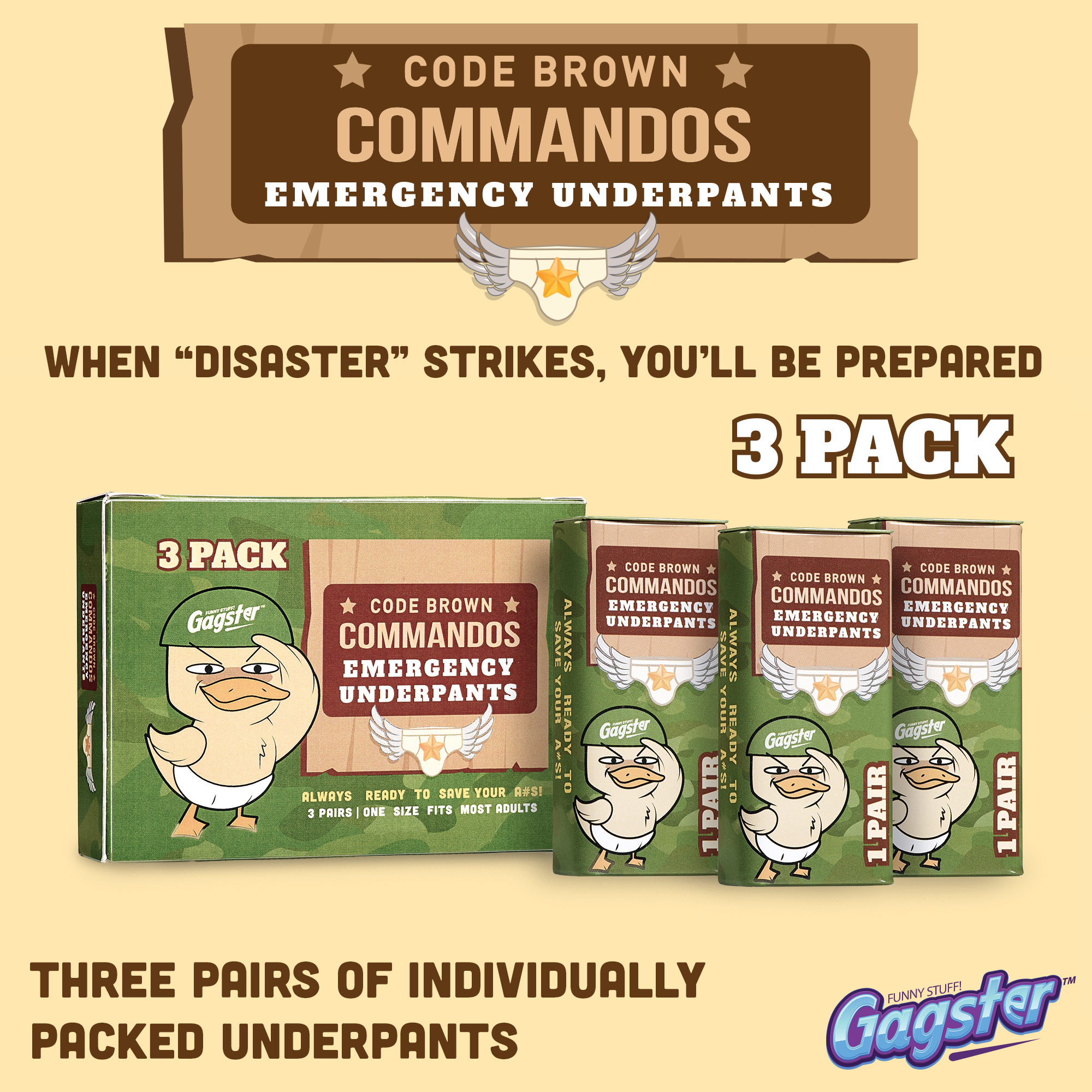 ➤ Do you like to have a fully stocked emergency kit at home, and in your car, in case of a disaster?➤ Sitting at a public party and spilled a drink on your lap and now your crotch is soaked to the skin?If so, Gagster Code Brown Commandos Emergency Underpants are just what you need!Soiled Underpants is NOT an Option!