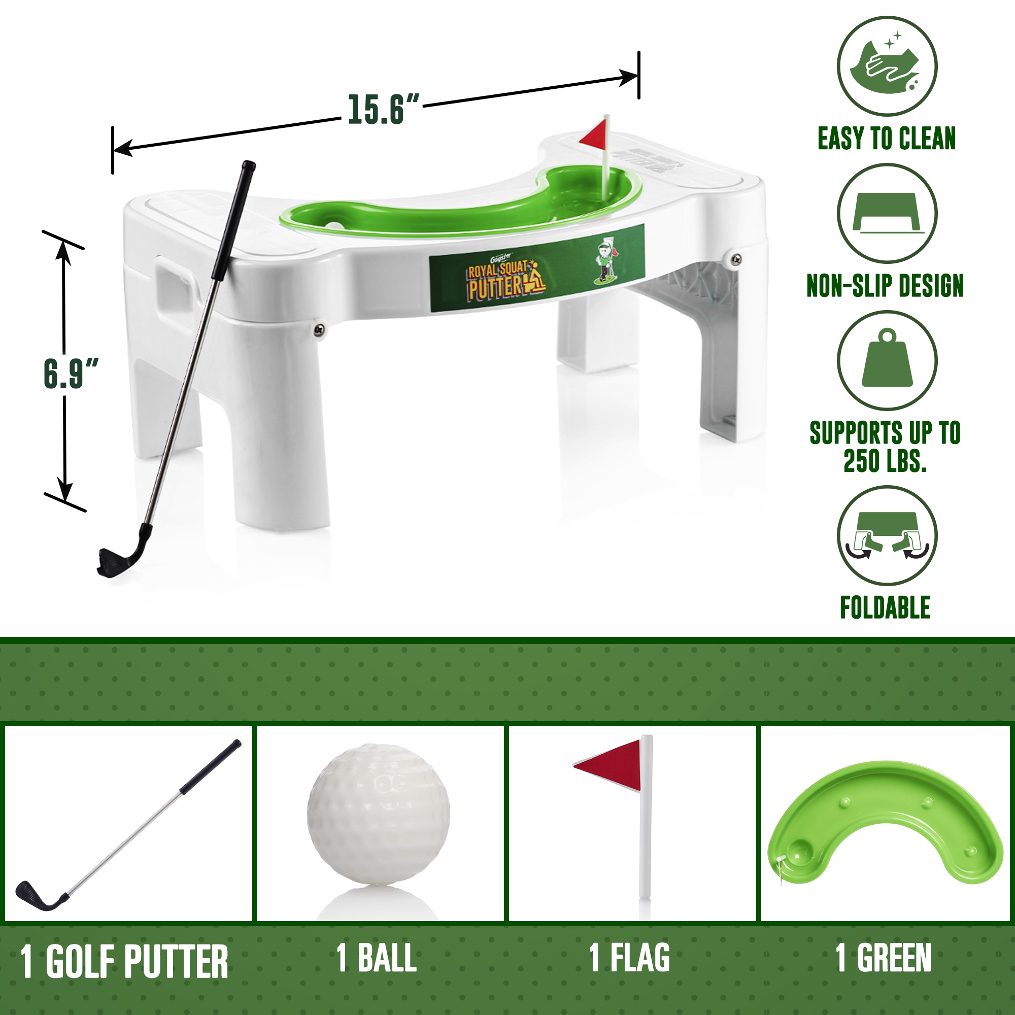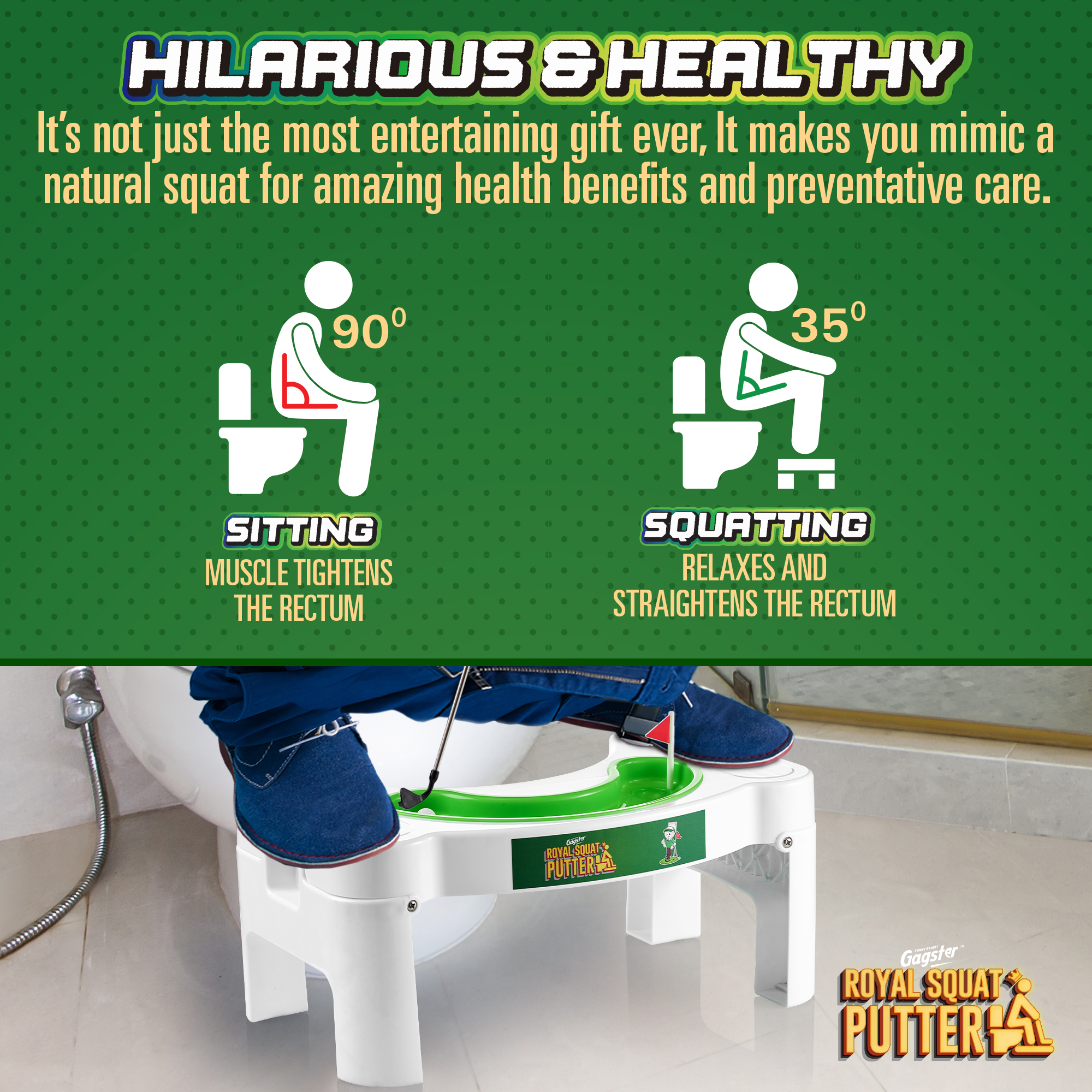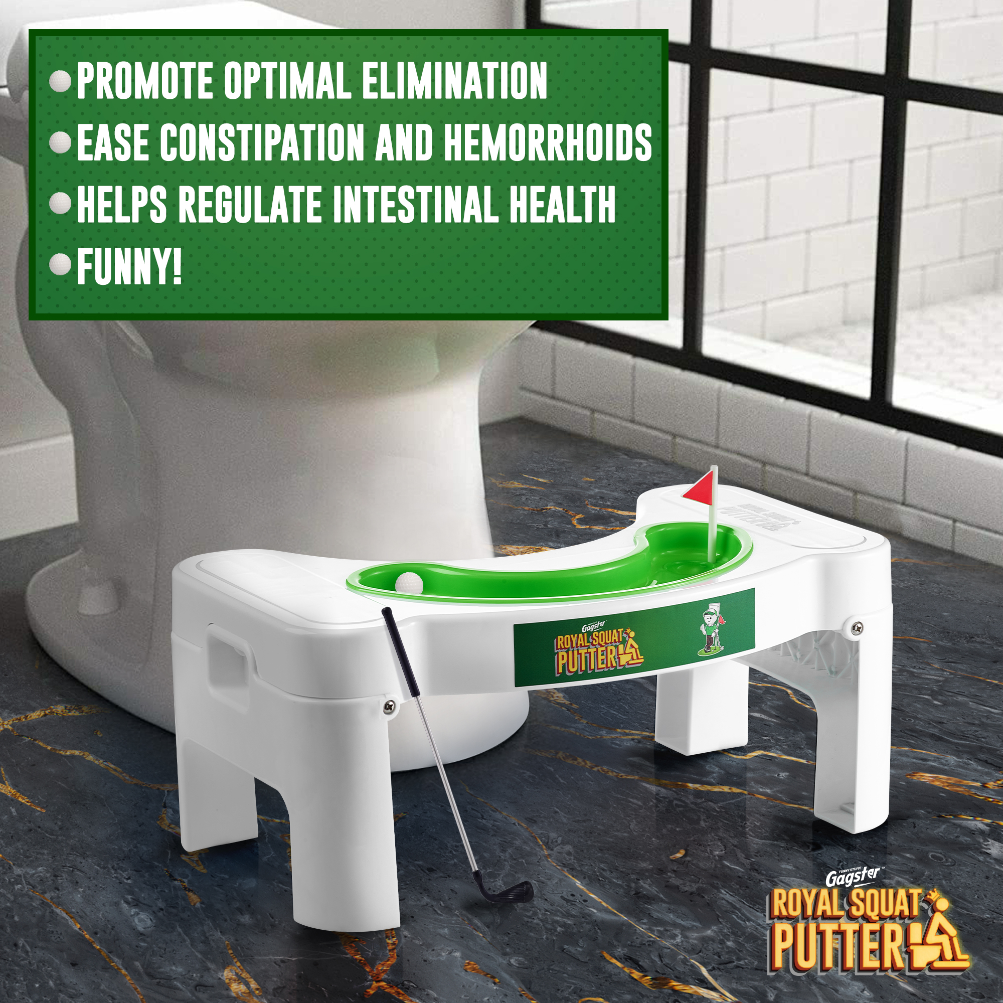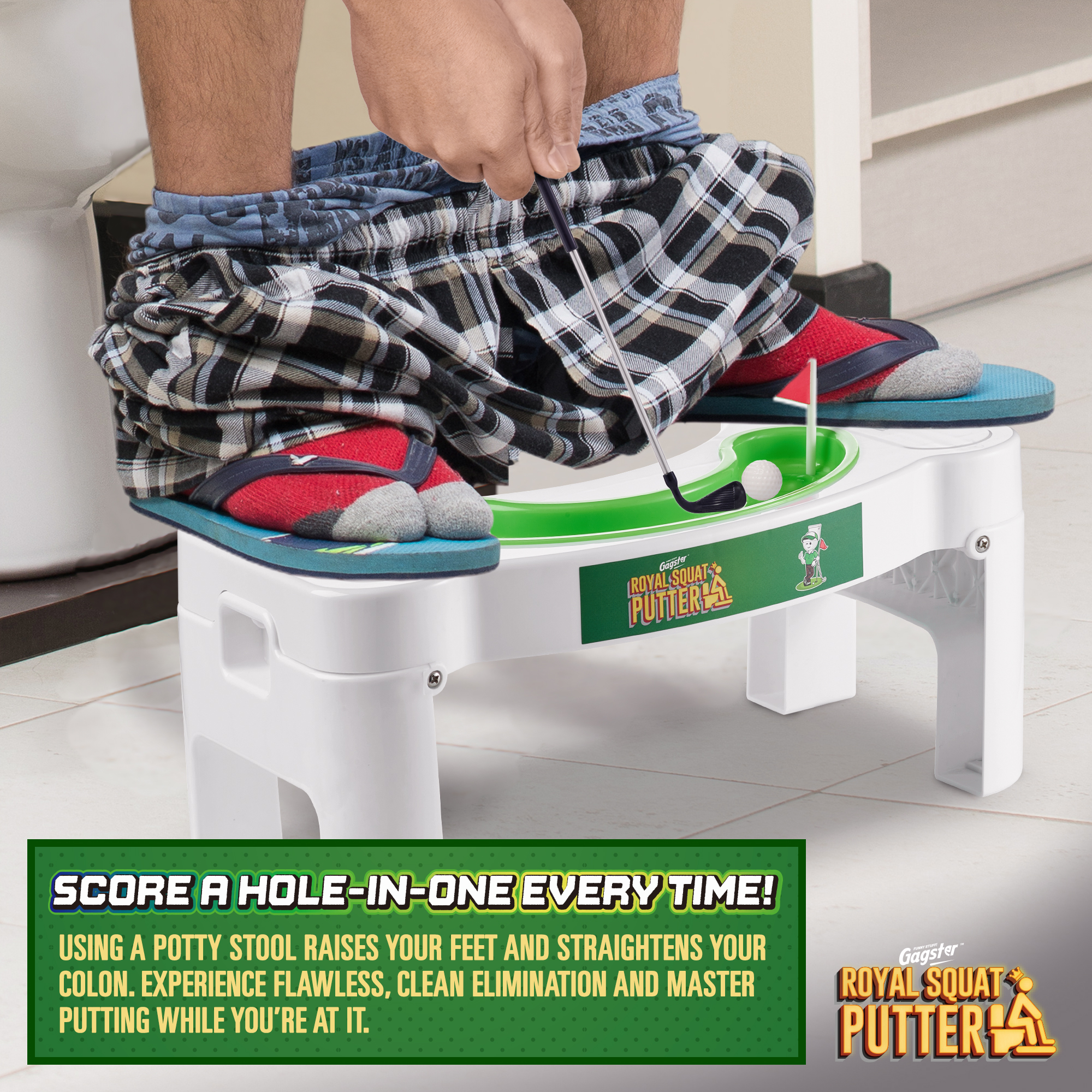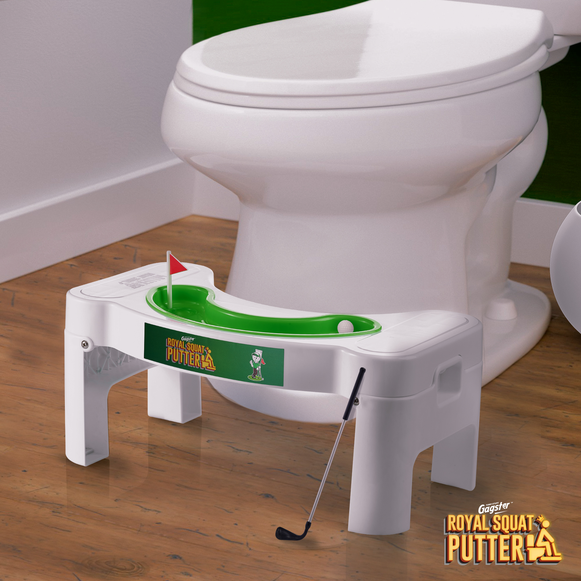 - Goodbye Flop Shots – Take back your time on the toilet by playing mini golf with the Gagster Royal Squat Putter Set! It comes with a squatty toilet stool and a mini-golf set so you can practice off the course, without having to yell “fore!” as you drop a hole-in-one. Our bathroom potty step stool elevates your feet to make it easier to punish the porcelain without any lip out.