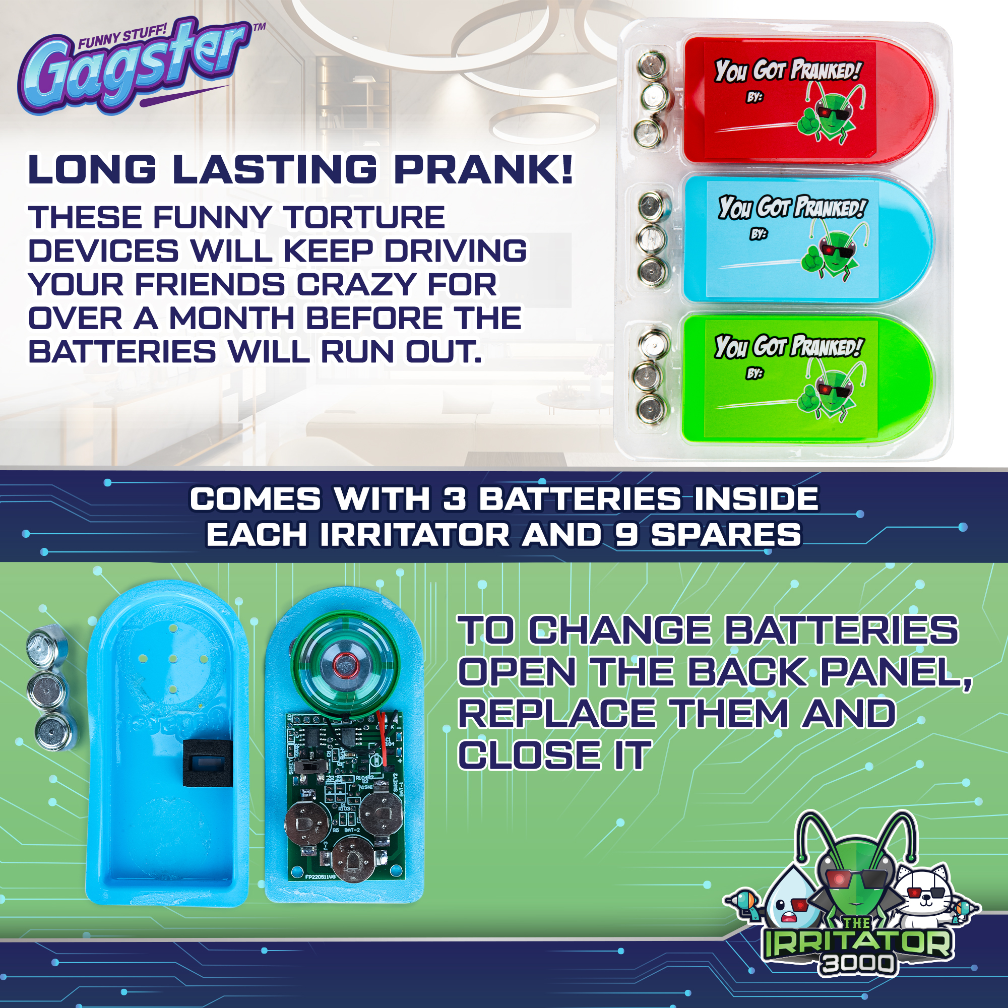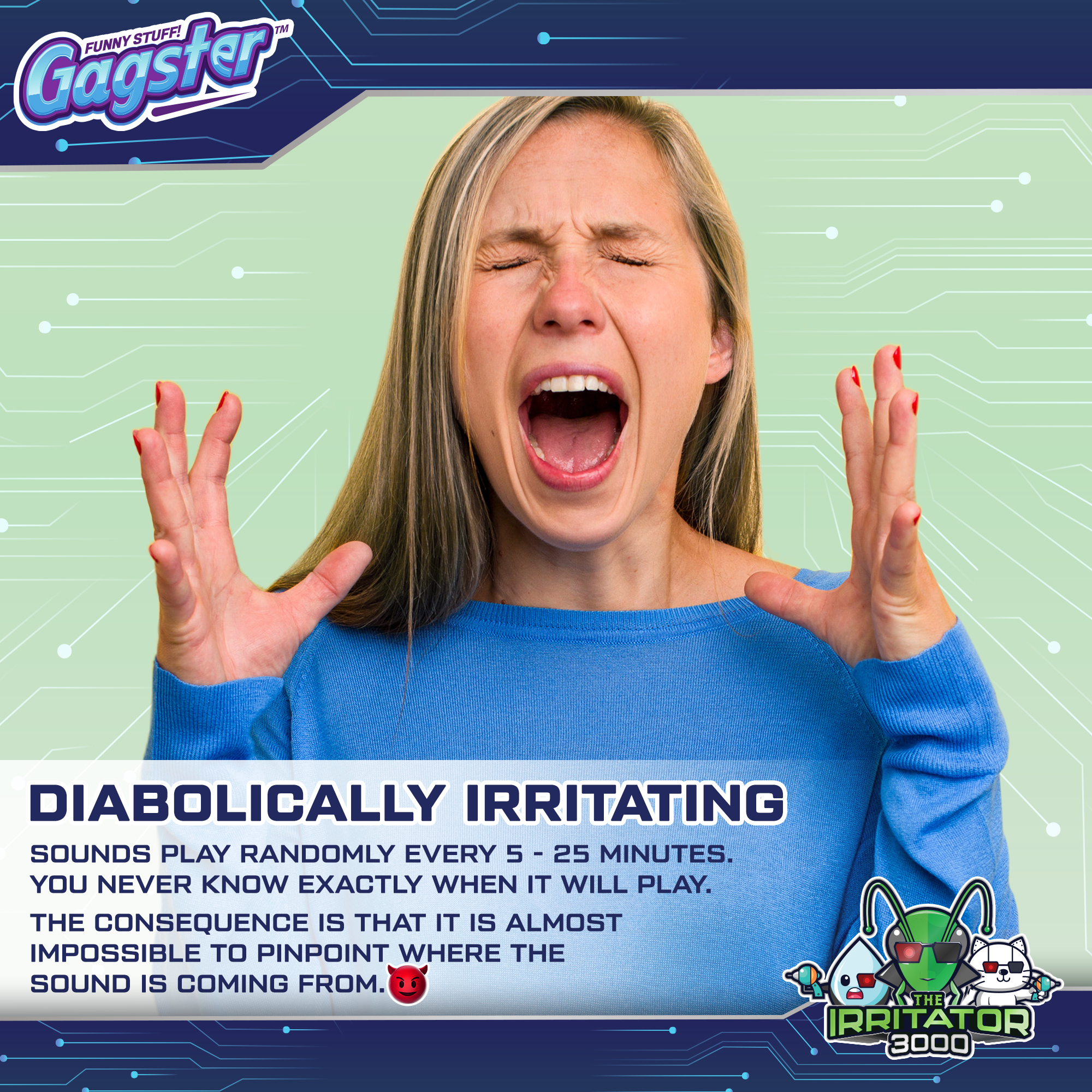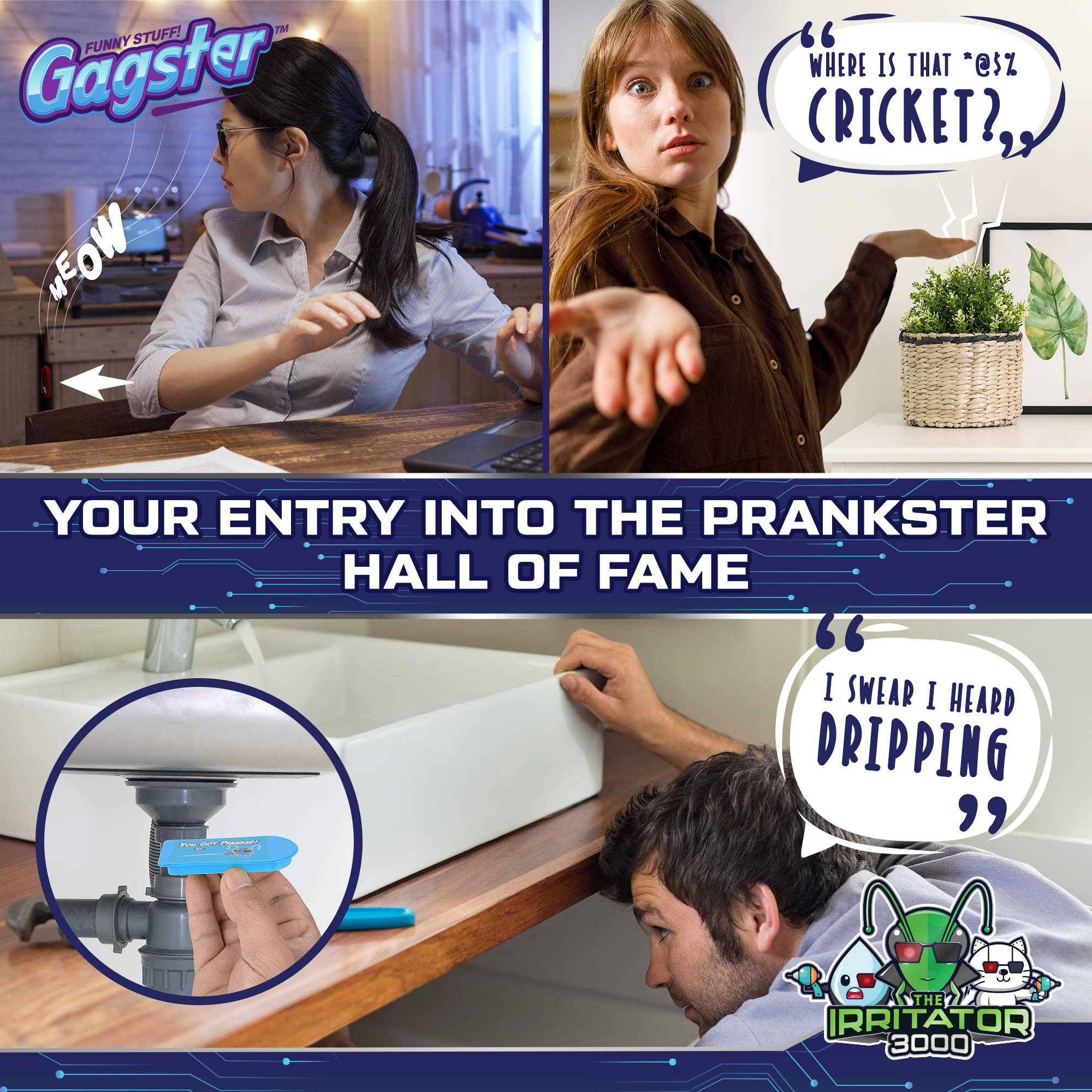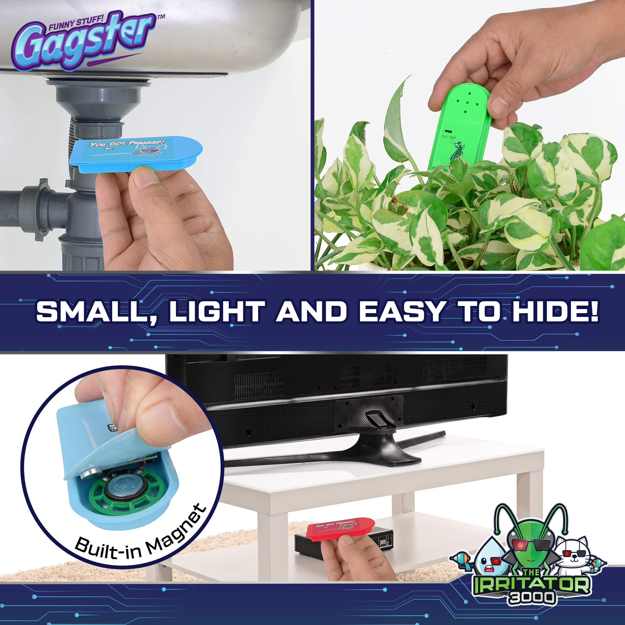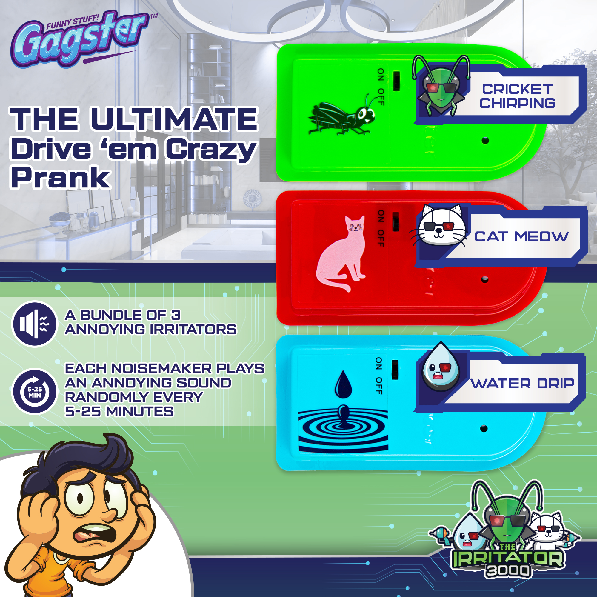 - Spice Up a Dull Day With The Irritator 3000 – A bundle of 3 annoying PCBs, cricket sounds, water drip, cat meow prank noisemakers. Magnetic & small at 1.5 x 3”, it’s really easy to hide this frickin’ machine.